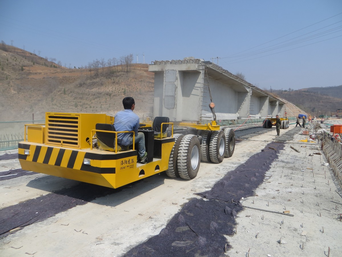 主要適用于預(yù)制梁場(chǎng)與架橋工地較遠(yuǎn),不適合鋪軌或鋪軌費(fèi)用較高的場(chǎng)合。運(yùn)梁車(chē)的剎車(chē)系統(tǒng)對(duì)縱坡有較大的適應(yīng)性。輪胎與地面摩擦阻力比軌道式運(yùn)梁車(chē)有顯著的優(yōu)勢(shì)。
